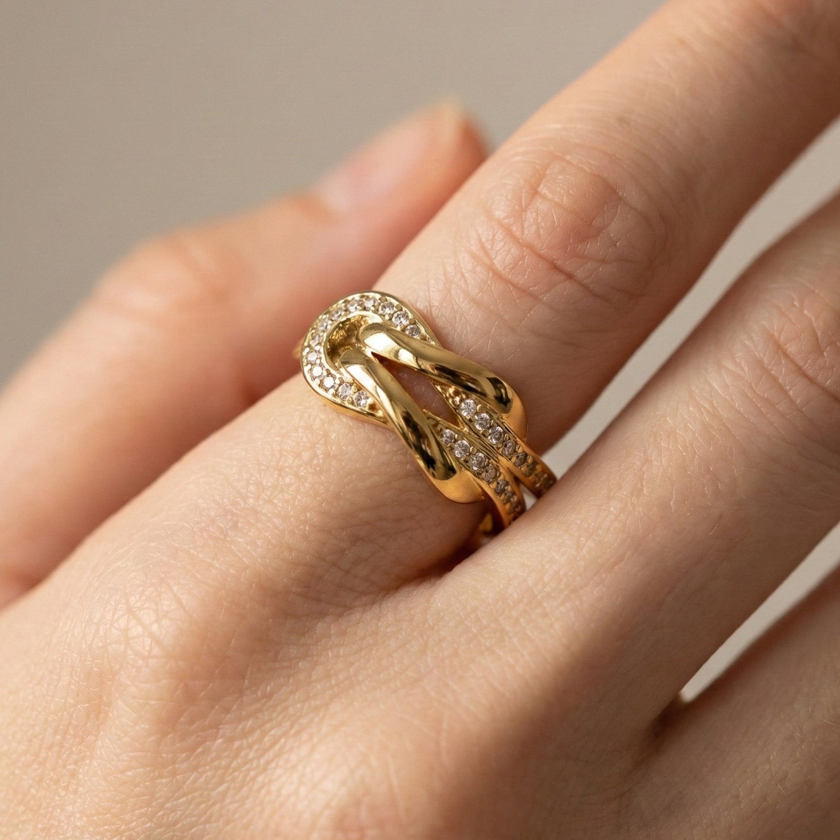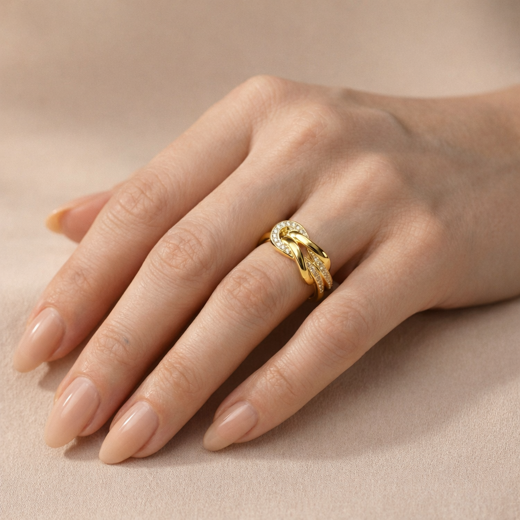 L’anello Twist È un nodo Infinito in Acciaio dorato e Pavé.