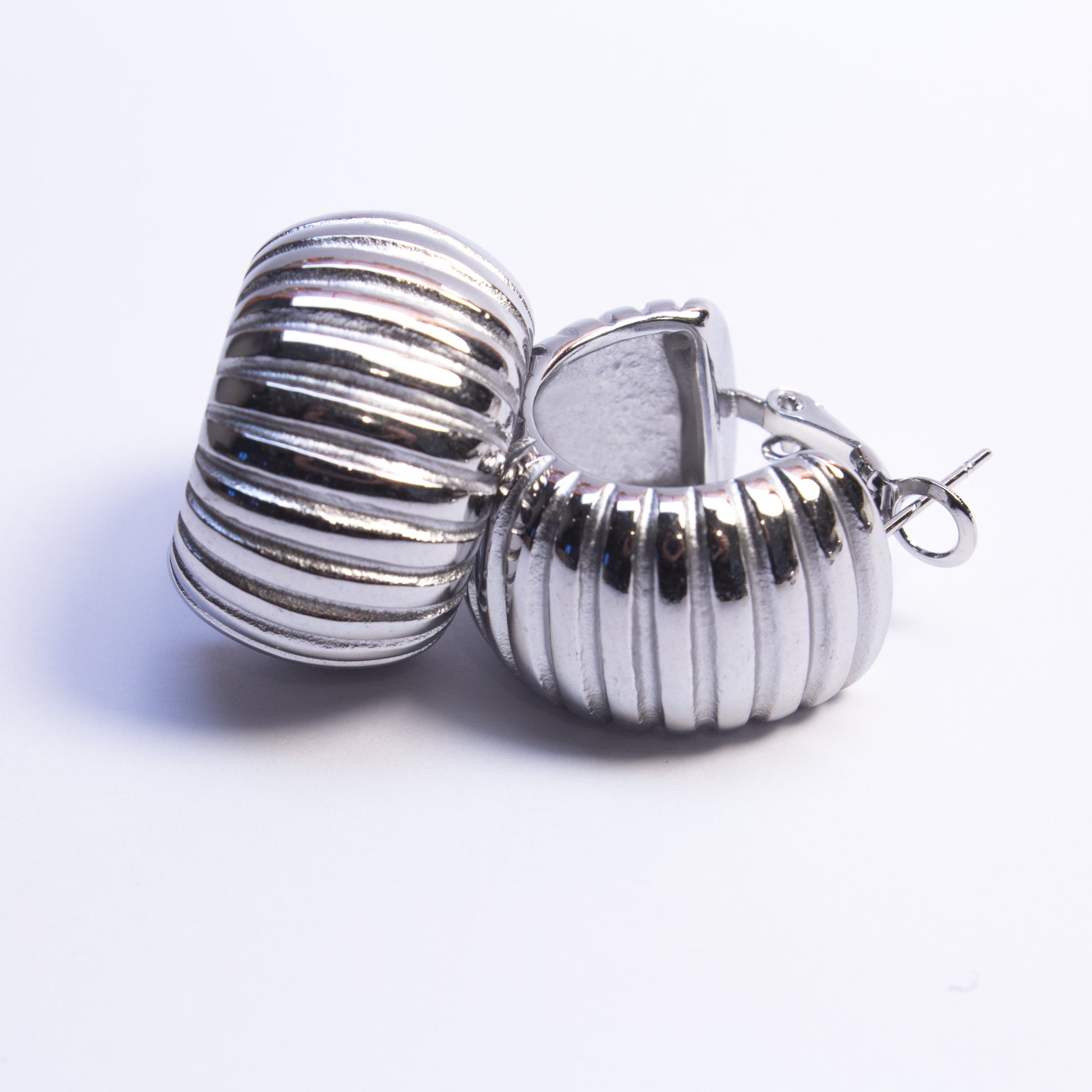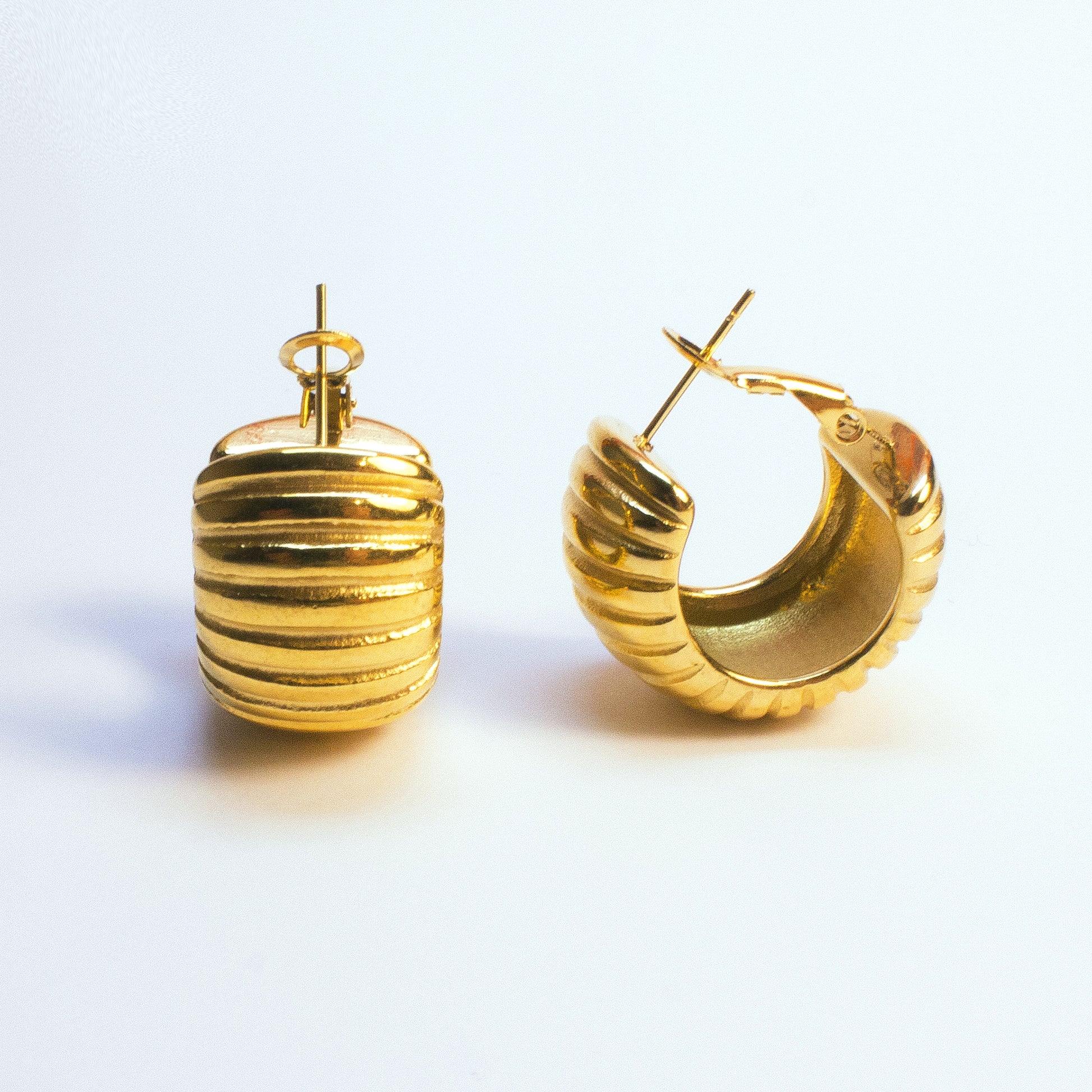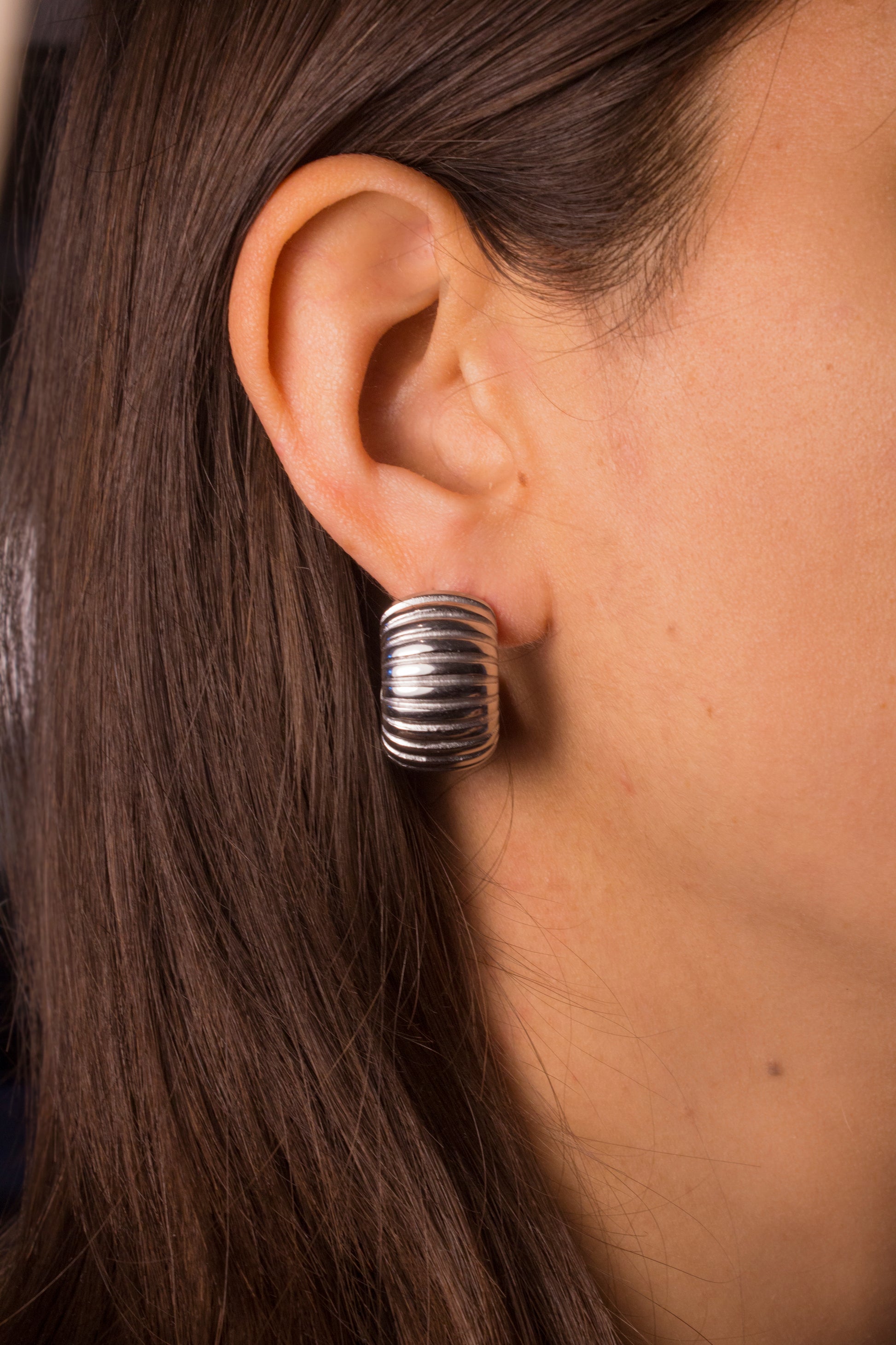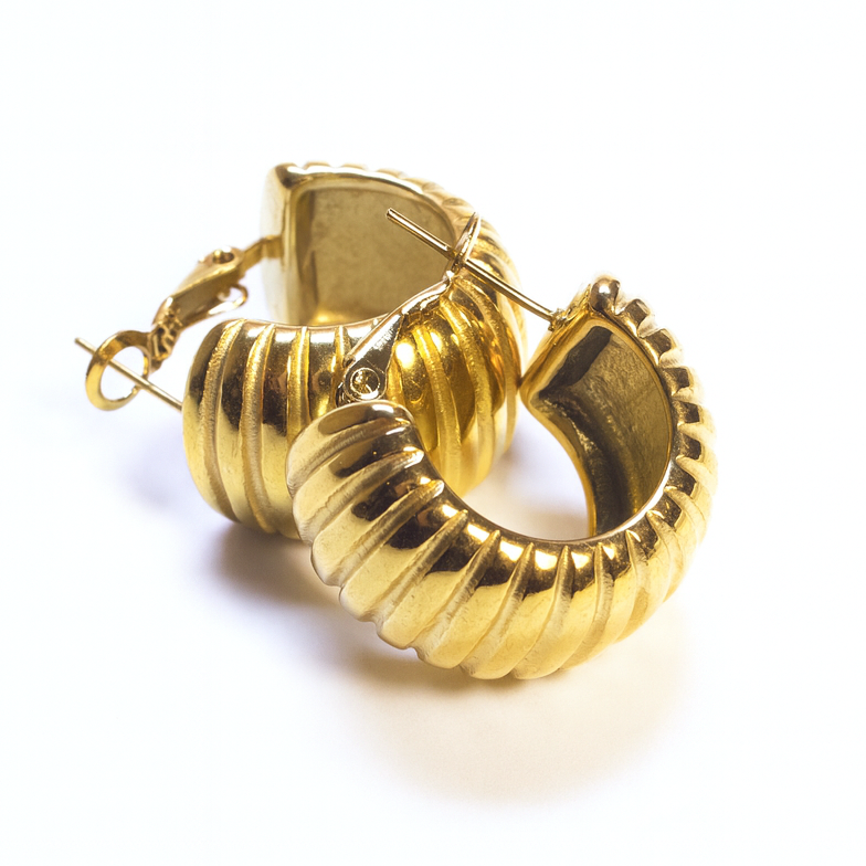 Orecchino a cerchio di 2,5cm con righe orizzontali in acciaio inox, dal sapore vintage e bold.