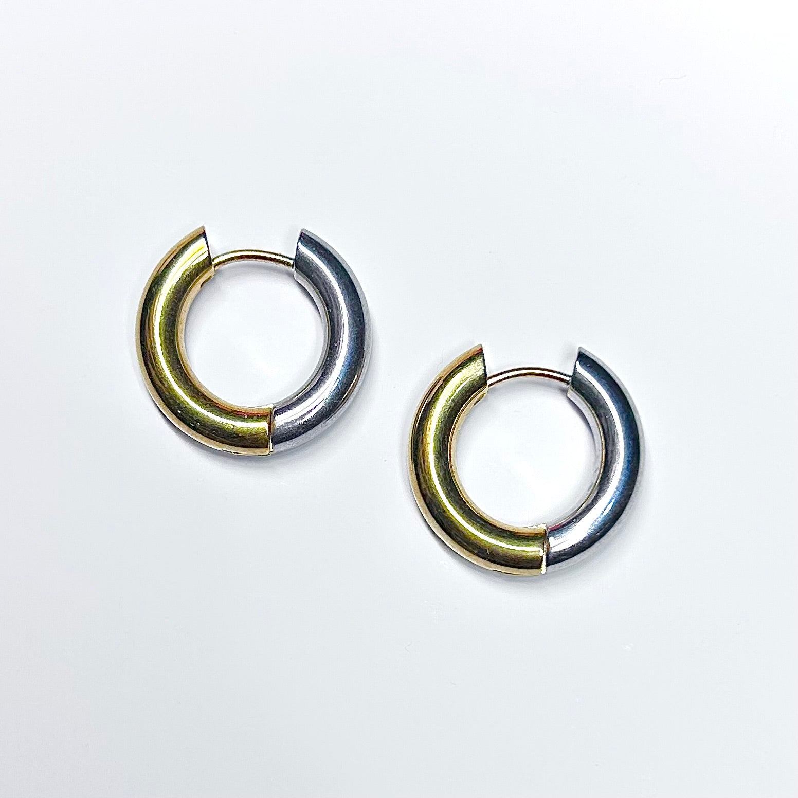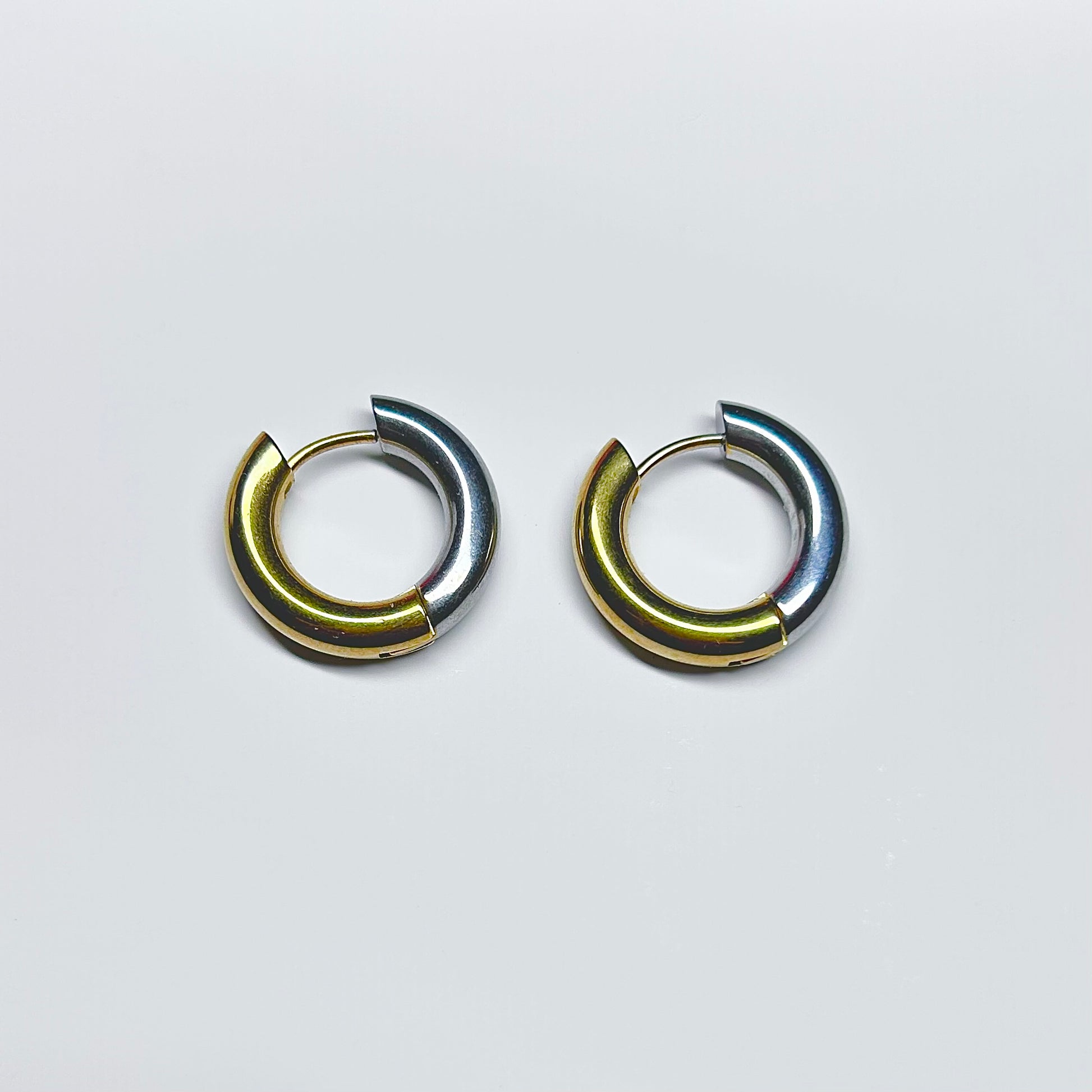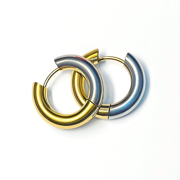 Orecchini a cerchio in acciaio spessi 4 mm, diametro 2 cm. Design metà oro e metà argento in un unico anello con finitura lucida e resistente. Leggeri, ipoallergenici e perfetti per un look essenziale ma ricercato.