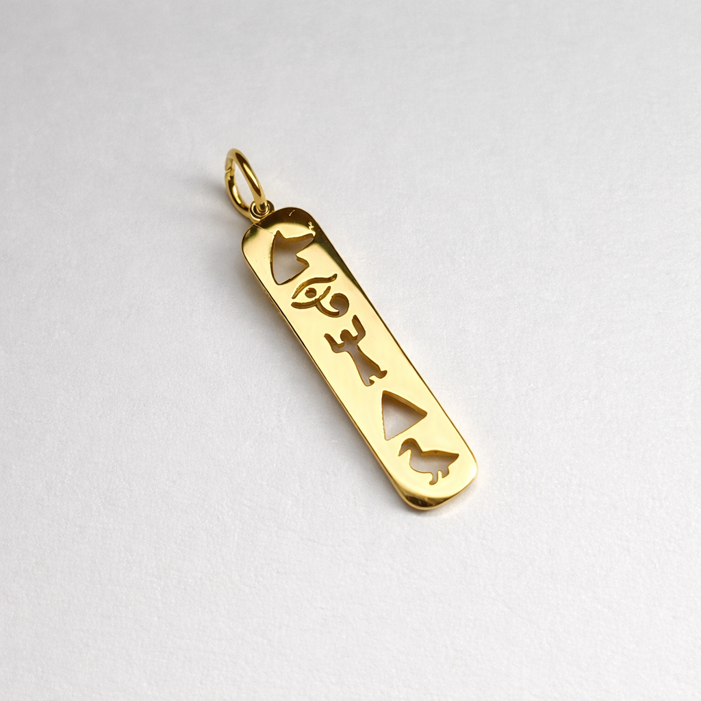 Ispirato alla forma del Cartiglio questo pendente è una vera e propria "stele" di buon auspicio. Leggendo dall'alto verso il basso, i simboli raccontano una storia di forza vitale: