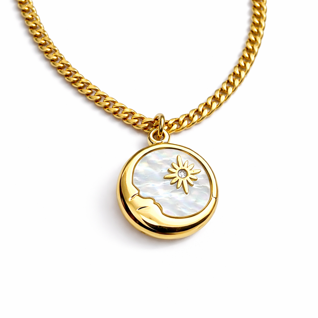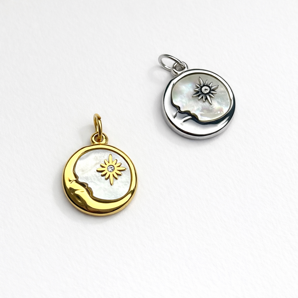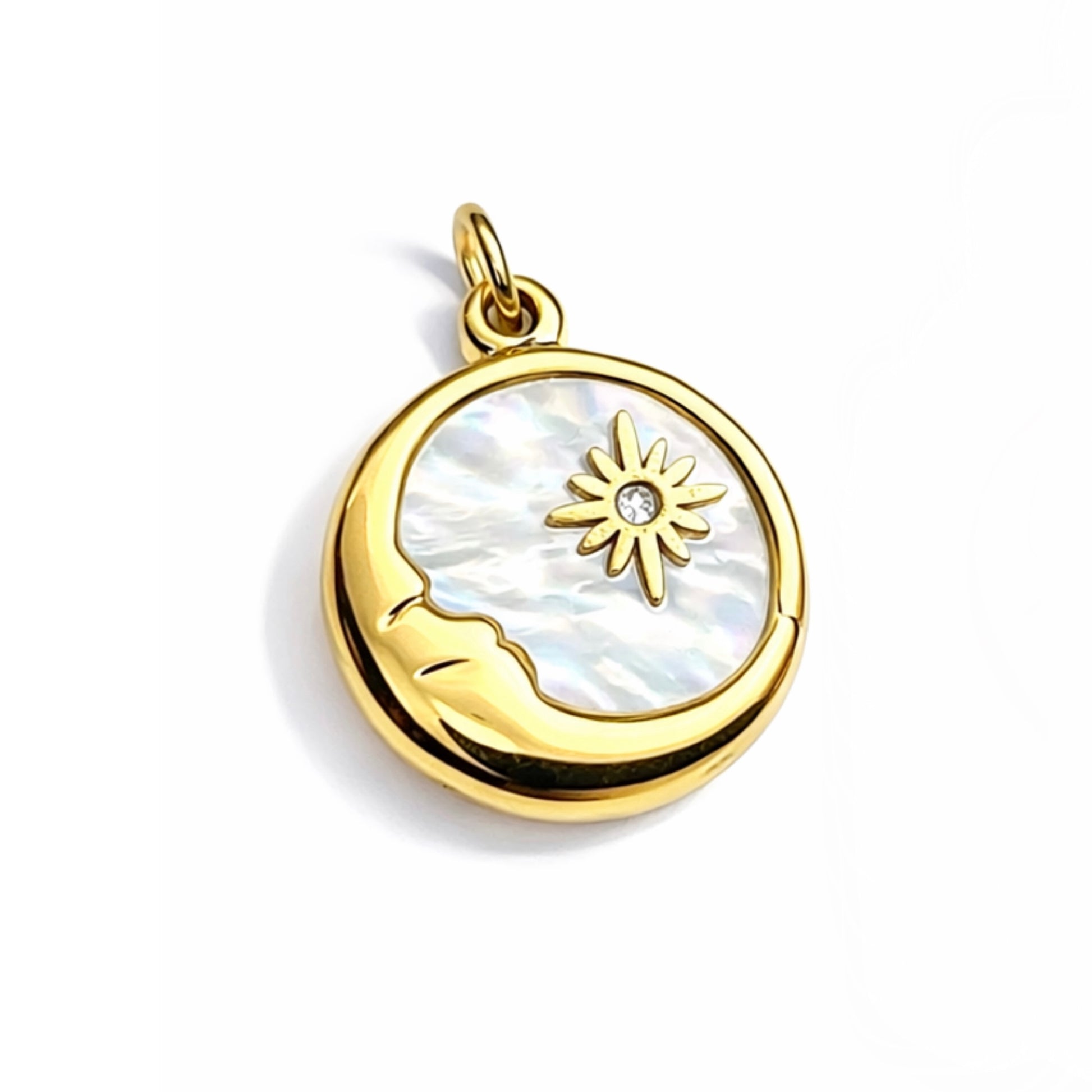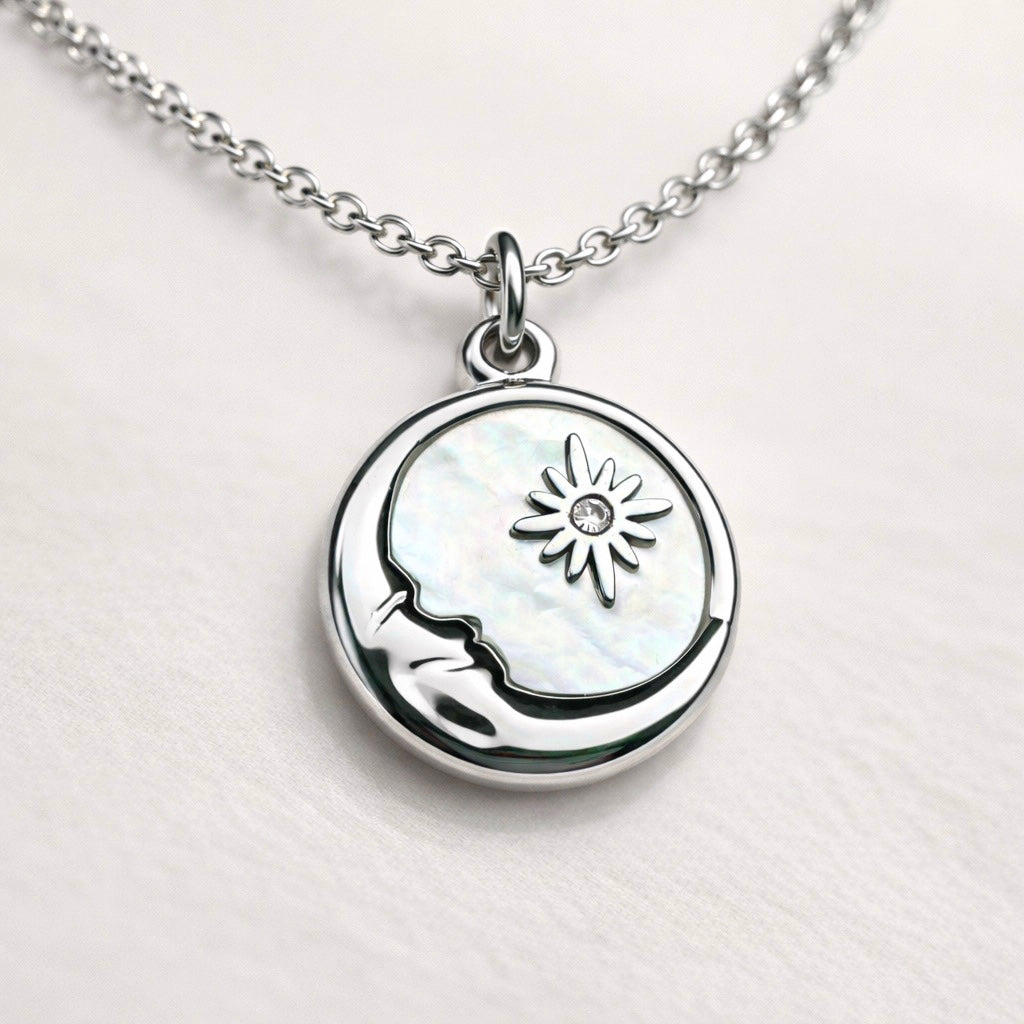 Questo incantevole ciondolo cattura l'abbraccio tra una luna dal volto sereno e una stella scintillante, adagiate su un delicato sfondo in vera madreperla.