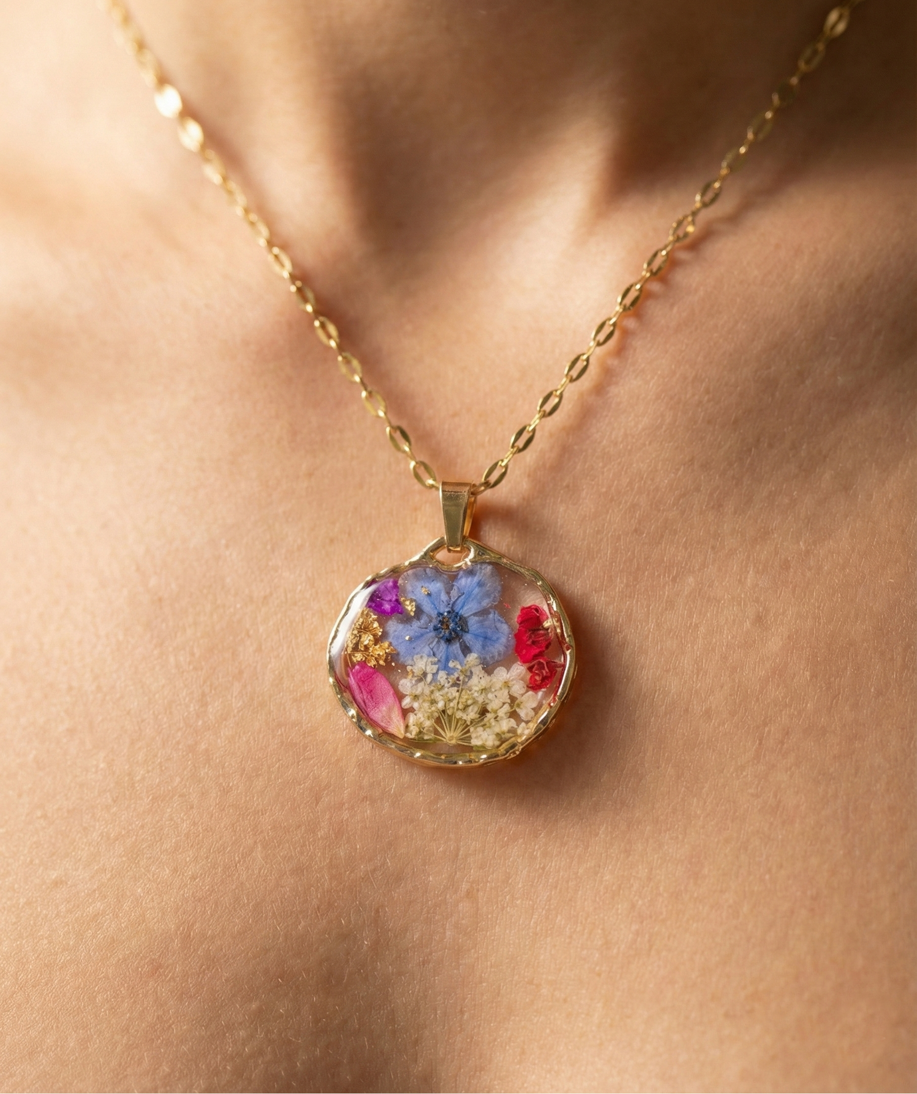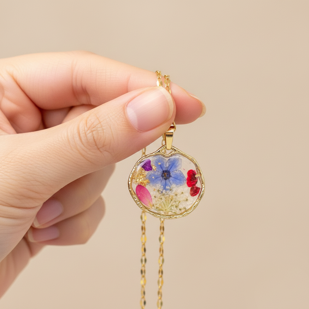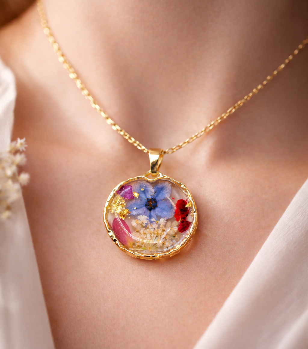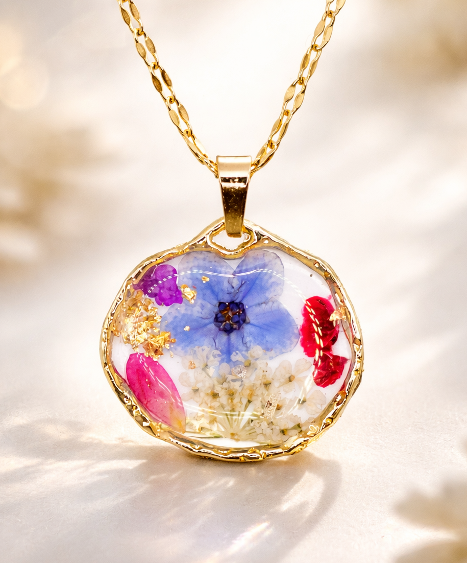 Ciondolo Giardino Fiorito - Fiori veri, Resina e Acciaio Inox