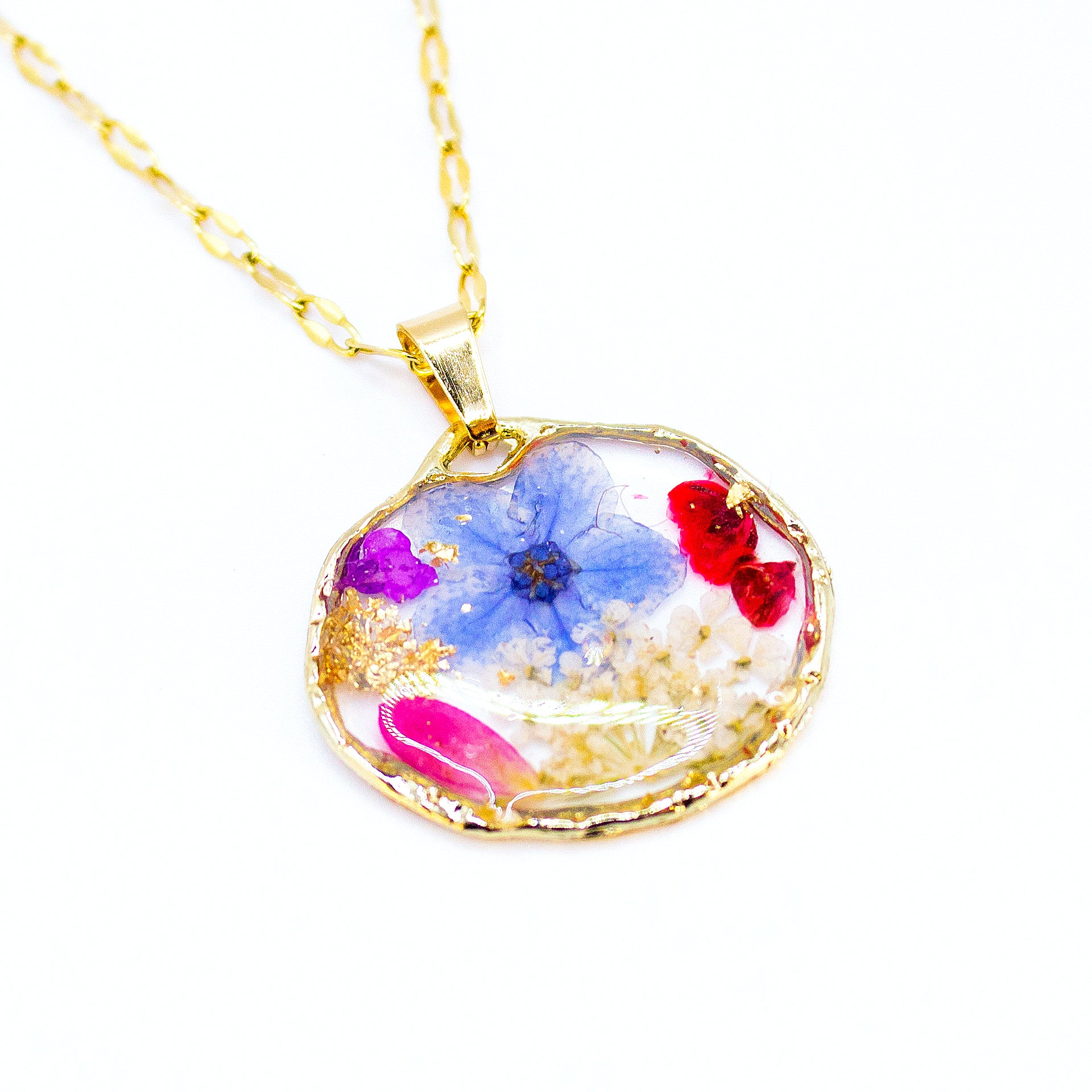 All’interno si riconoscono una delicato Non ti scordar di me blu, petali rossi di rosa e fucsia, fiori bianchi di carota e frammenti dorati, disposti in un equilibrio leggero e armonioso.