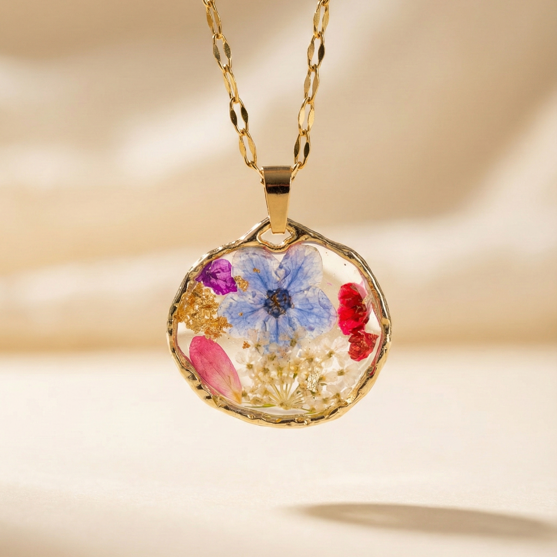 La cornice dorata irregolare circonda la resina come un piccolo giardino luminoso, mettendo in risalto ogni dettaglio naturale. Ogni pezzo è unico perché racchiude fiori veri diversi tra loro, conservati nella loro forma originale.