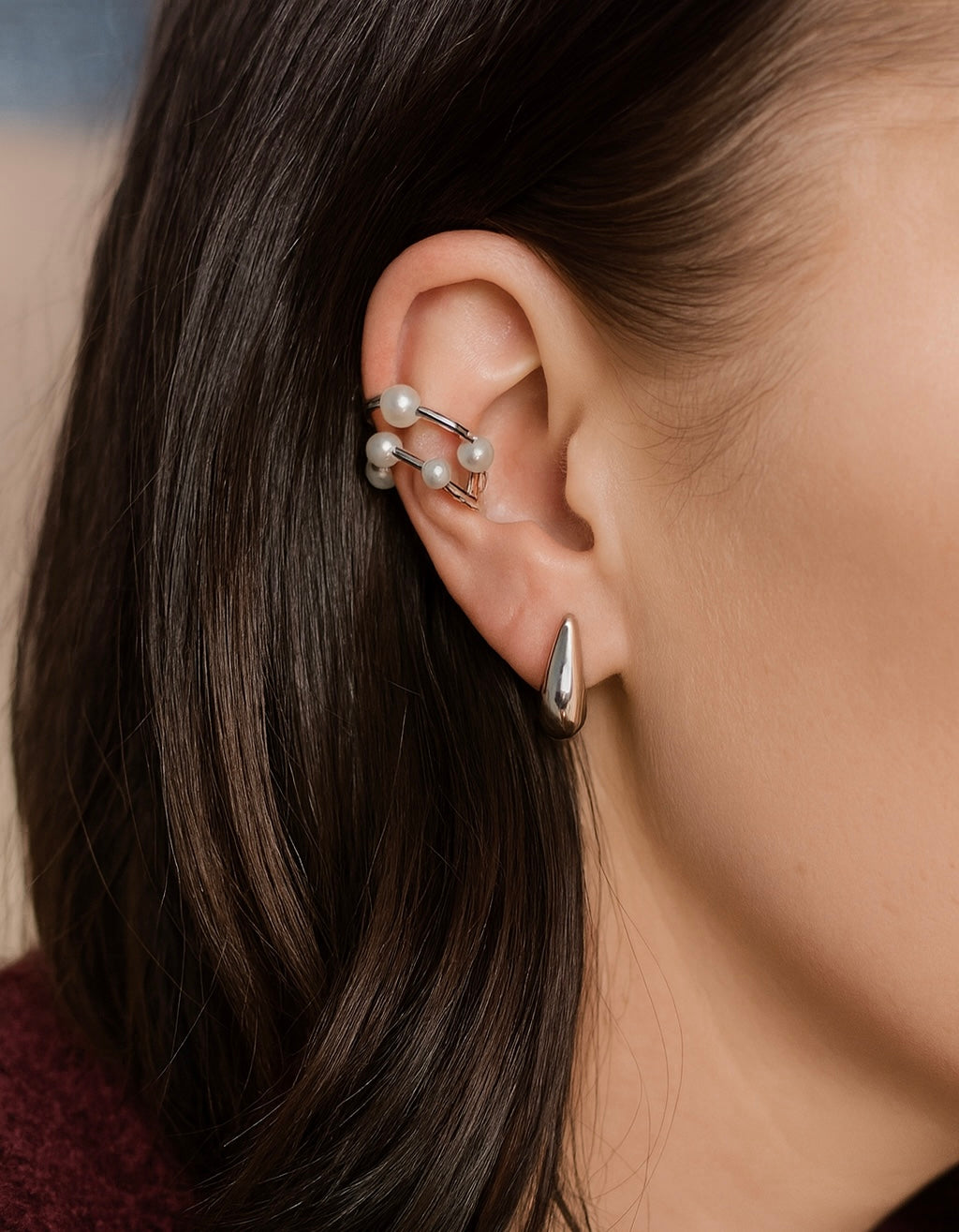 Earcuff in acciaio composto da due archi sottili arricchiti da piccole perle bianche distribuite lungo la struttura. Il design leggero e luminoso si appoggia all’orecchio senza bisogno di fori, creando un effetto elegante e delicato. Le perle aggiungono un tocco raffinato e brillante, rendendolo un dettaglio perfetto da abbinare ad altri orecchini o da indossare da solo per un look minimal chic.