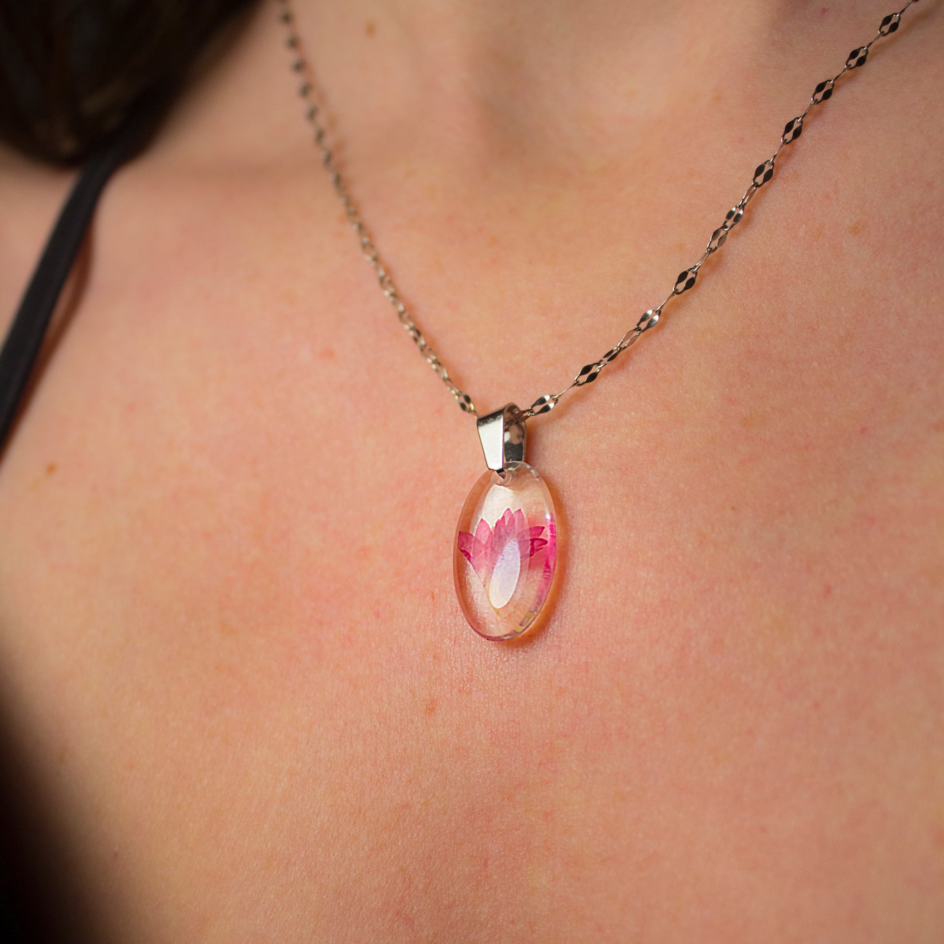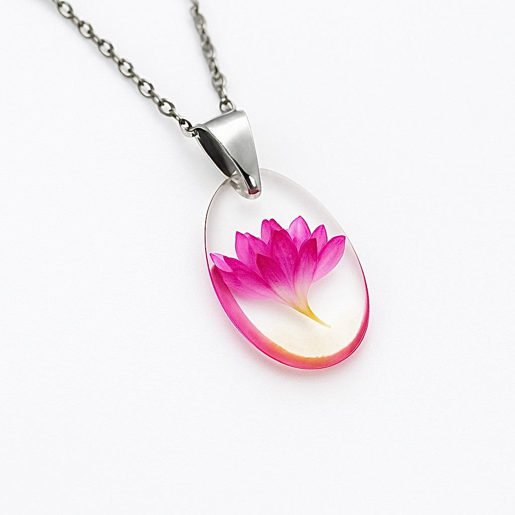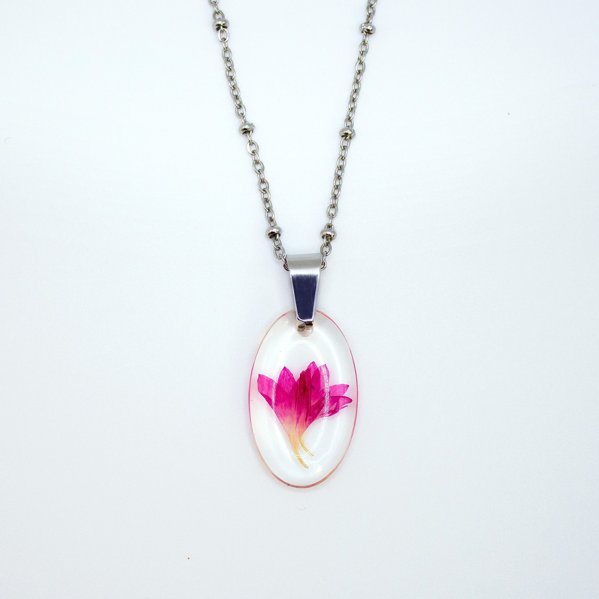 Collana in resina e fiori veri, fiore rosa/fucsia per un tocco di colore adatto a tutte le stagioni, dolcezza e purezza in questa composizione semplice ma raffinata. Senza castone, limato e rifinito con aspetto lucido in ogni sua parte.