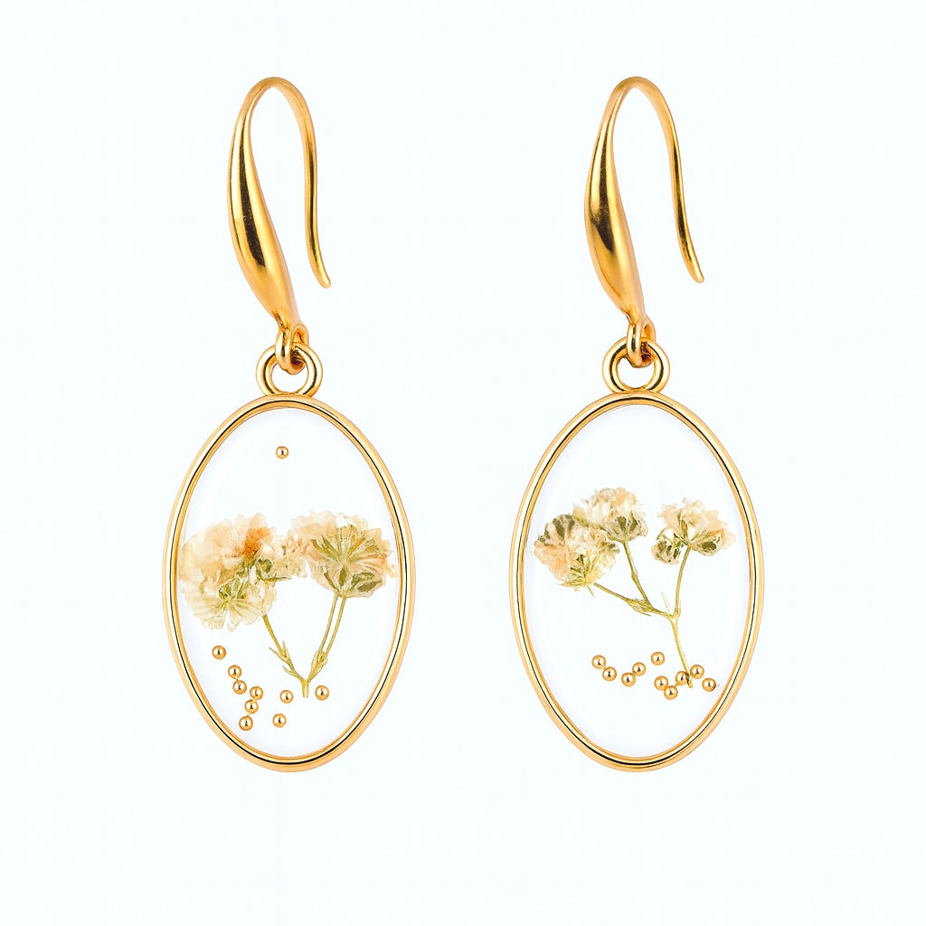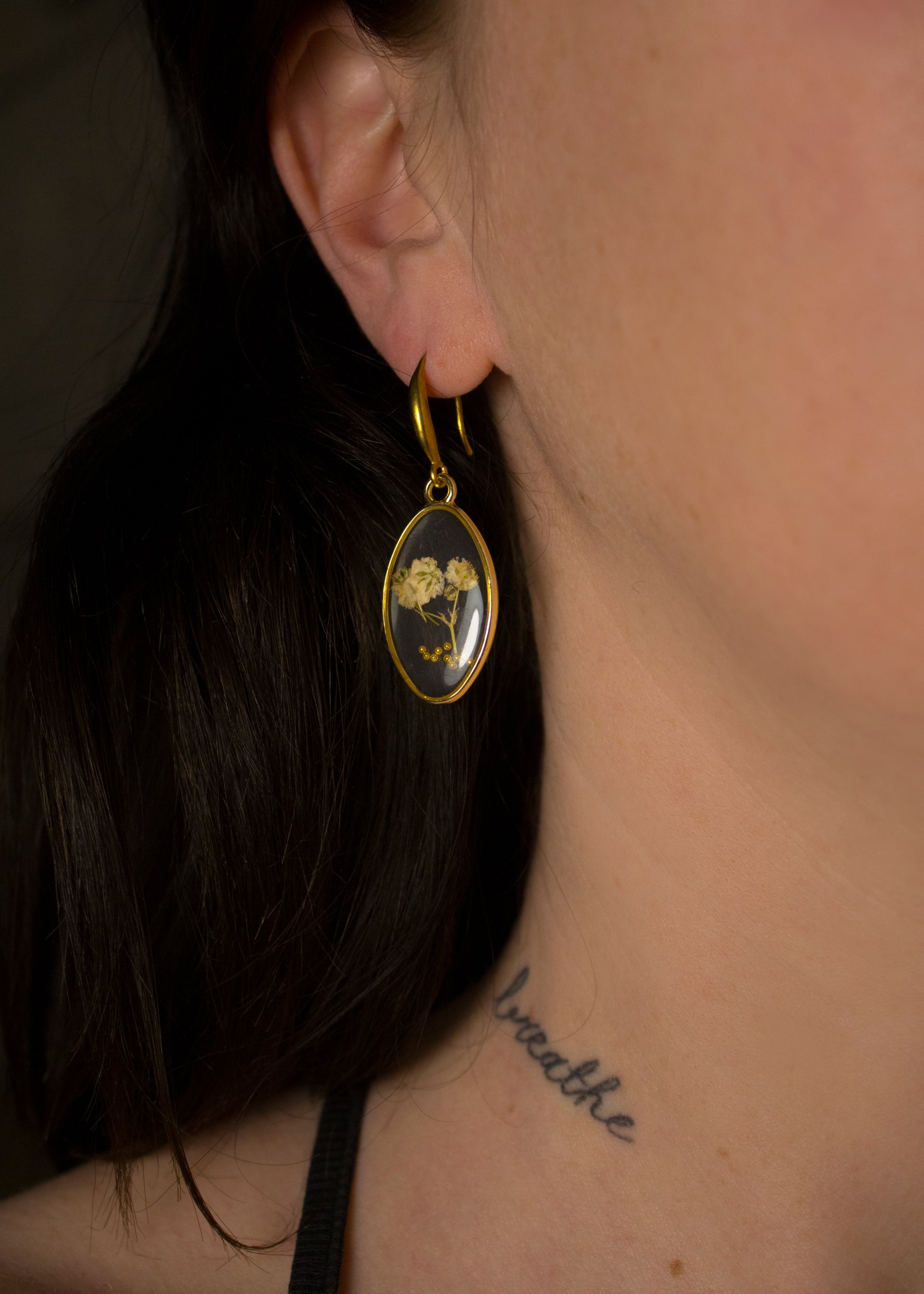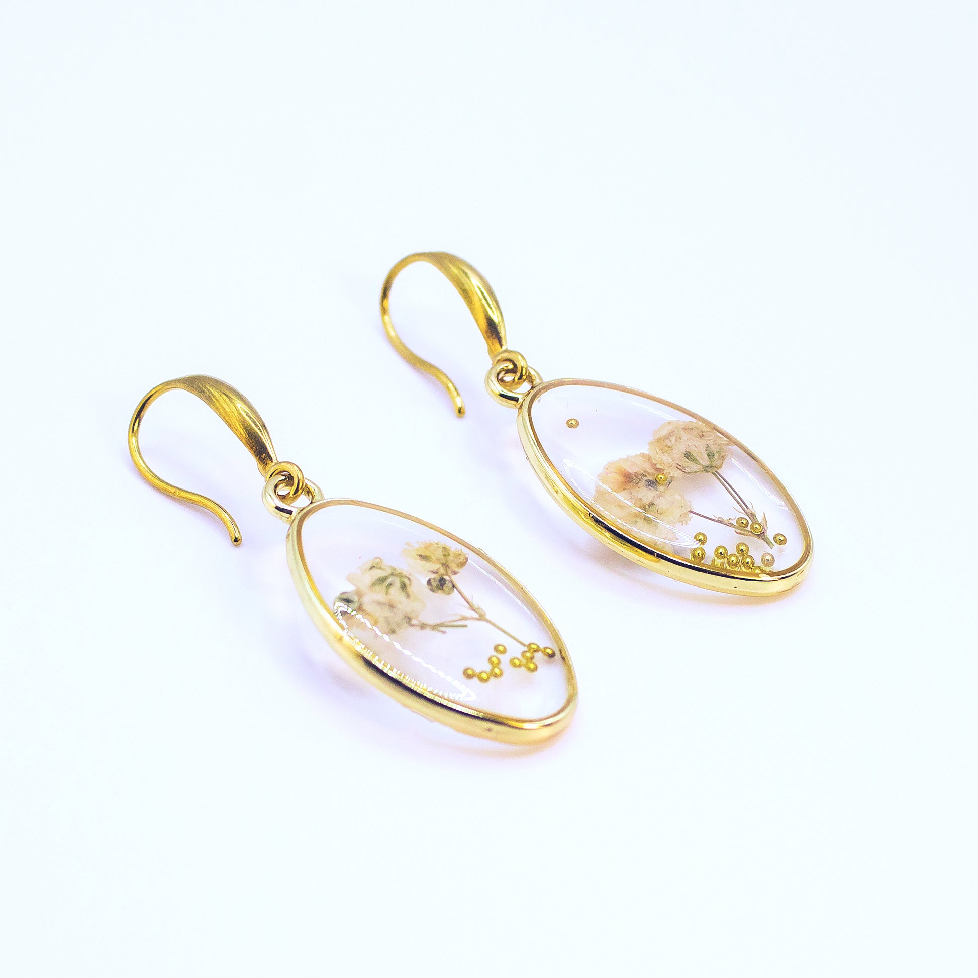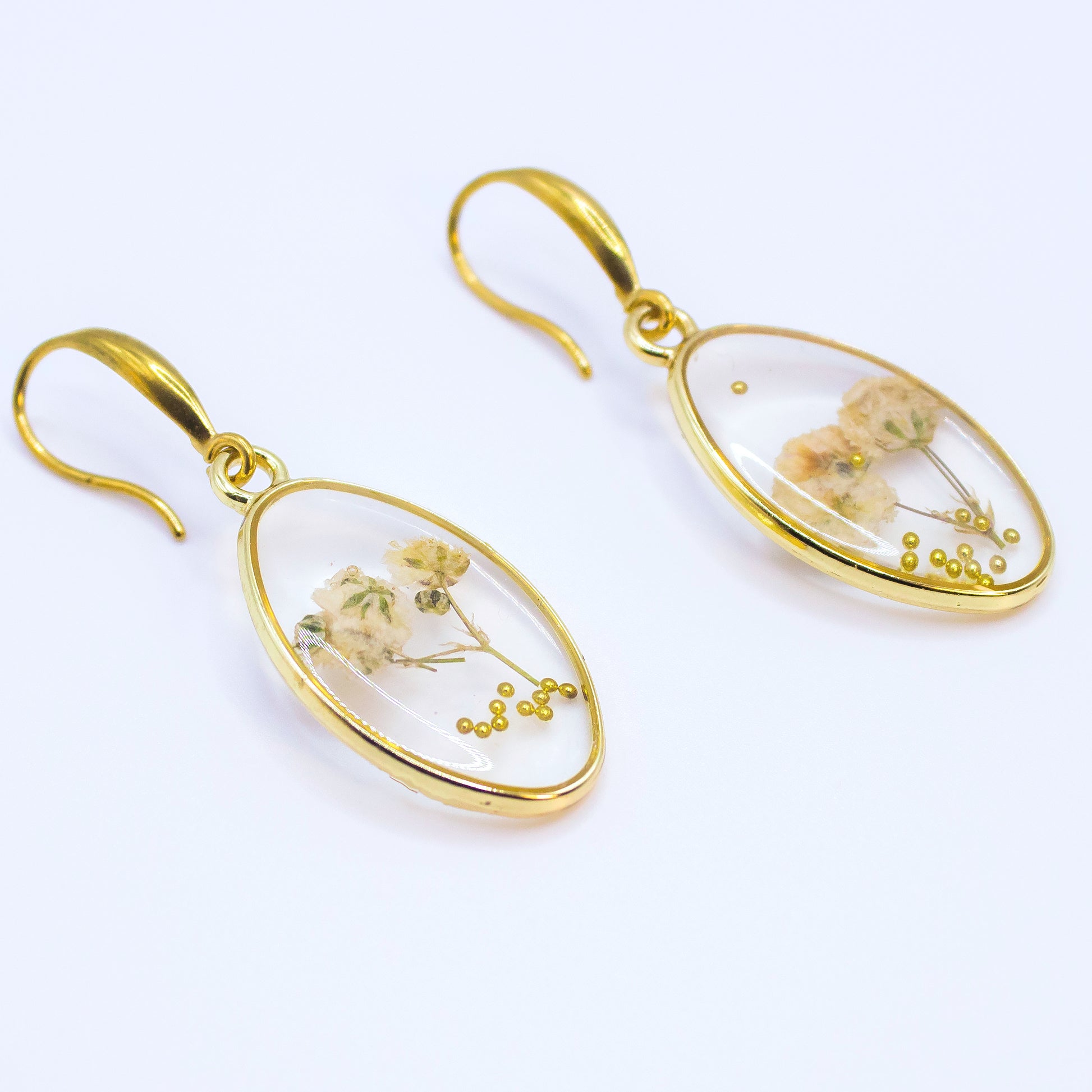 Orecchini in resina e fiori veri. Utilizzando solo fiori bianchi abbiamo dato a questo orecchino una delicatezza innata, da portare quotidianamente.