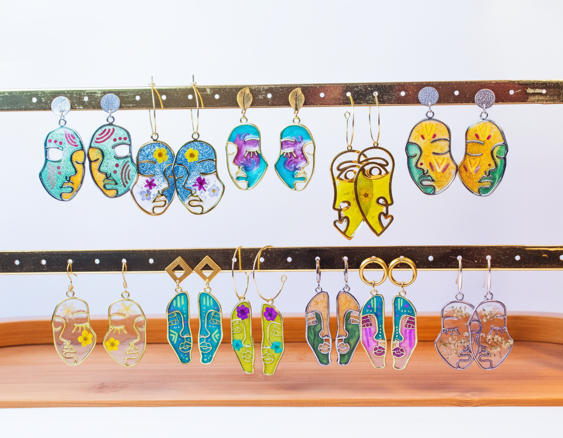 Tantissimi modelli di orecchini a facce con fiori veri o dipinti a mano. Sono tutti pezzi unici, quindi selezionate l'orecchino che preferite, e sarà solo vostro !