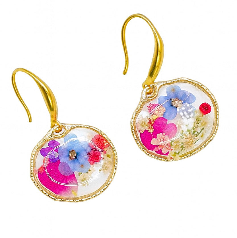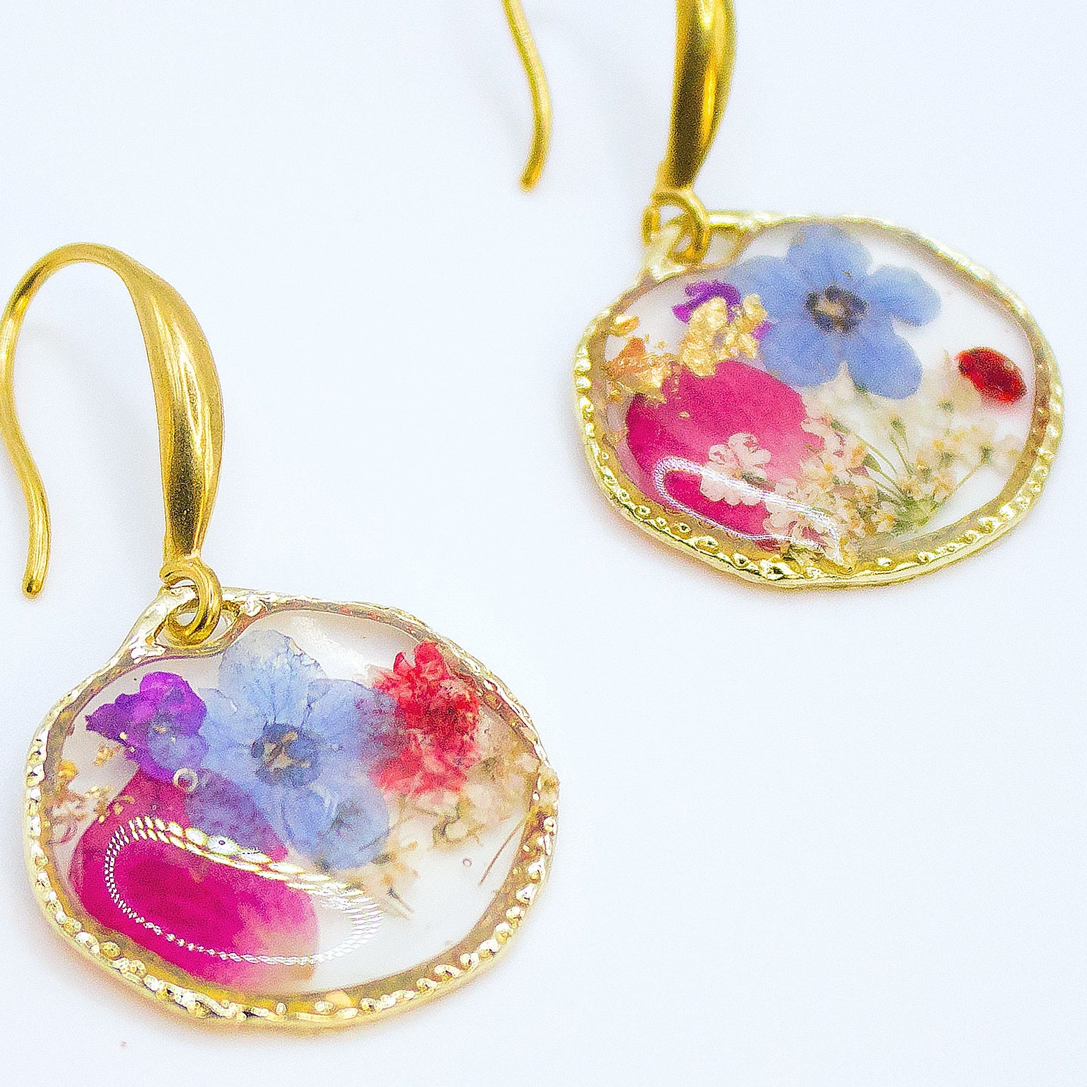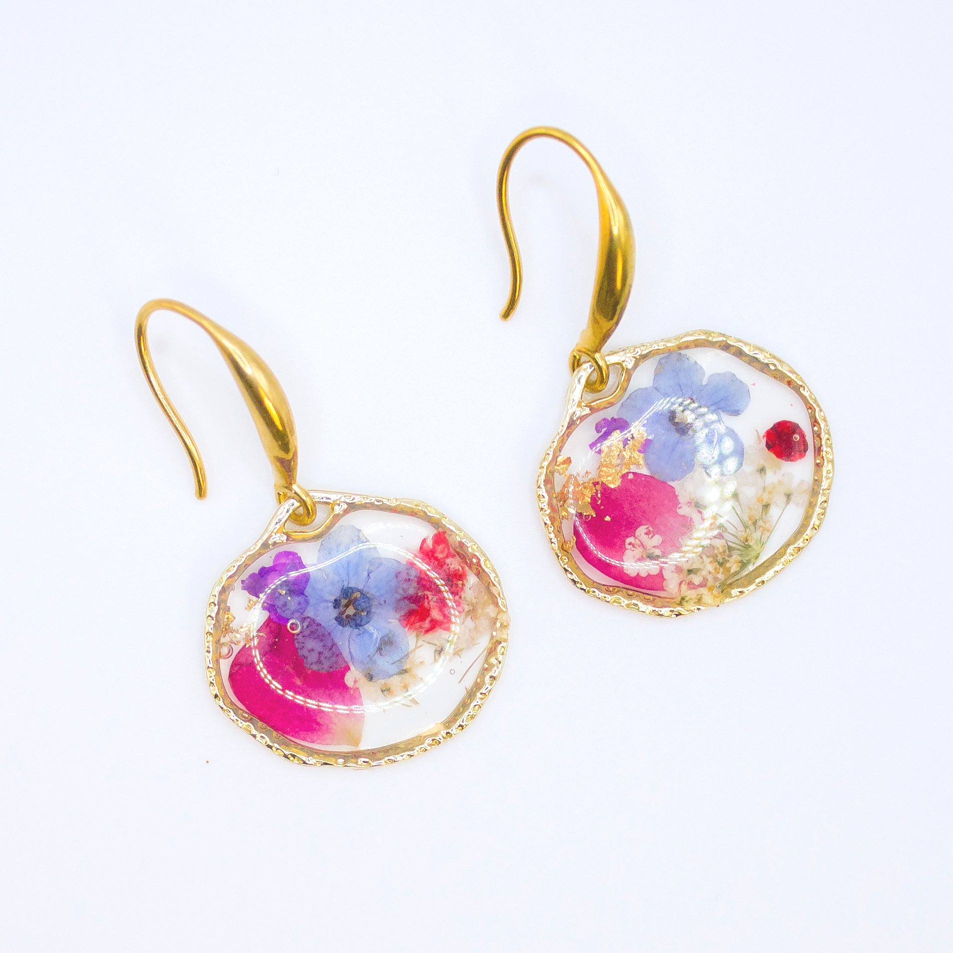 Orecchini in resina e fiori veri, una composizione che ricorda un bouquet di fiori da indossare e portare sempre con sé, colorato, vivace e romantico.