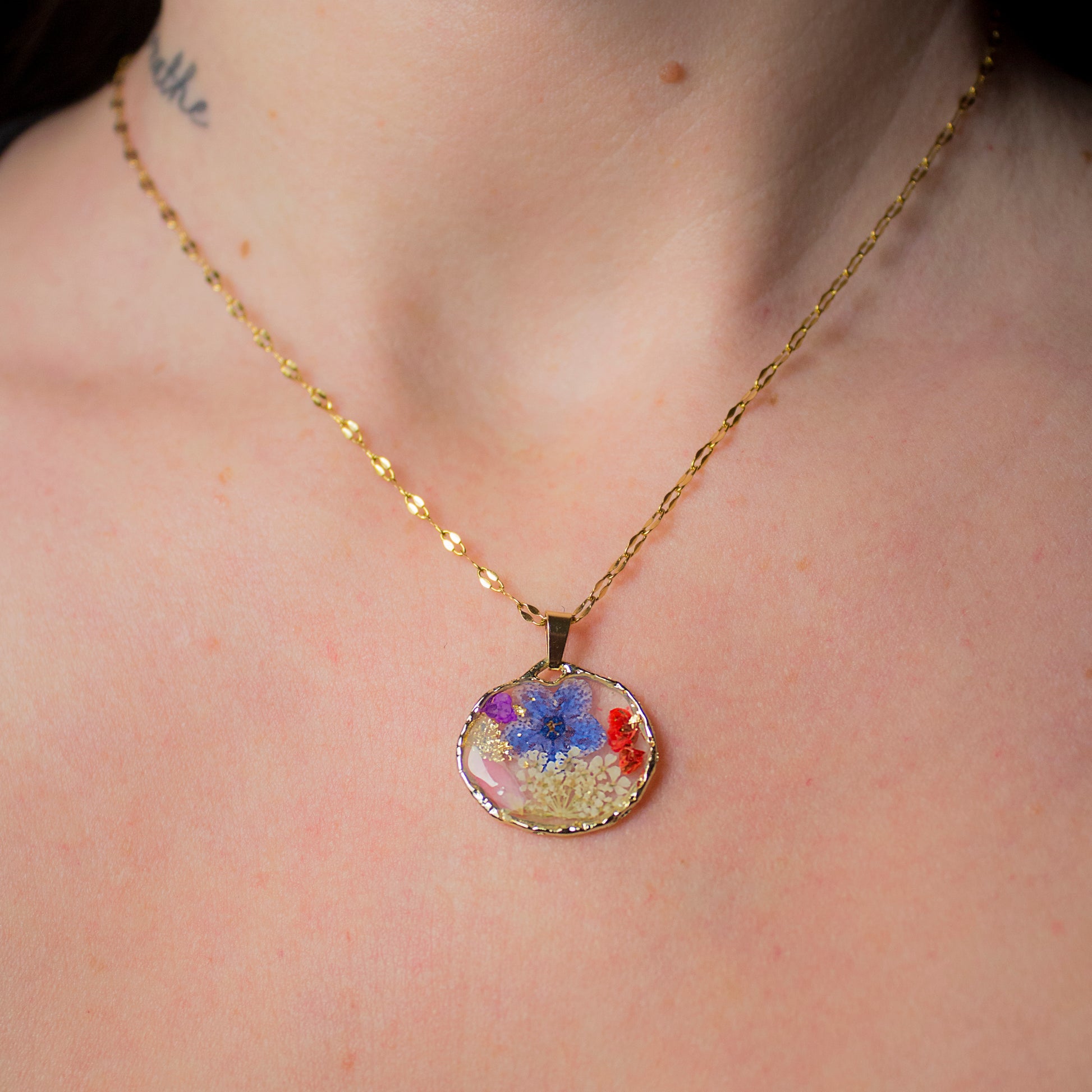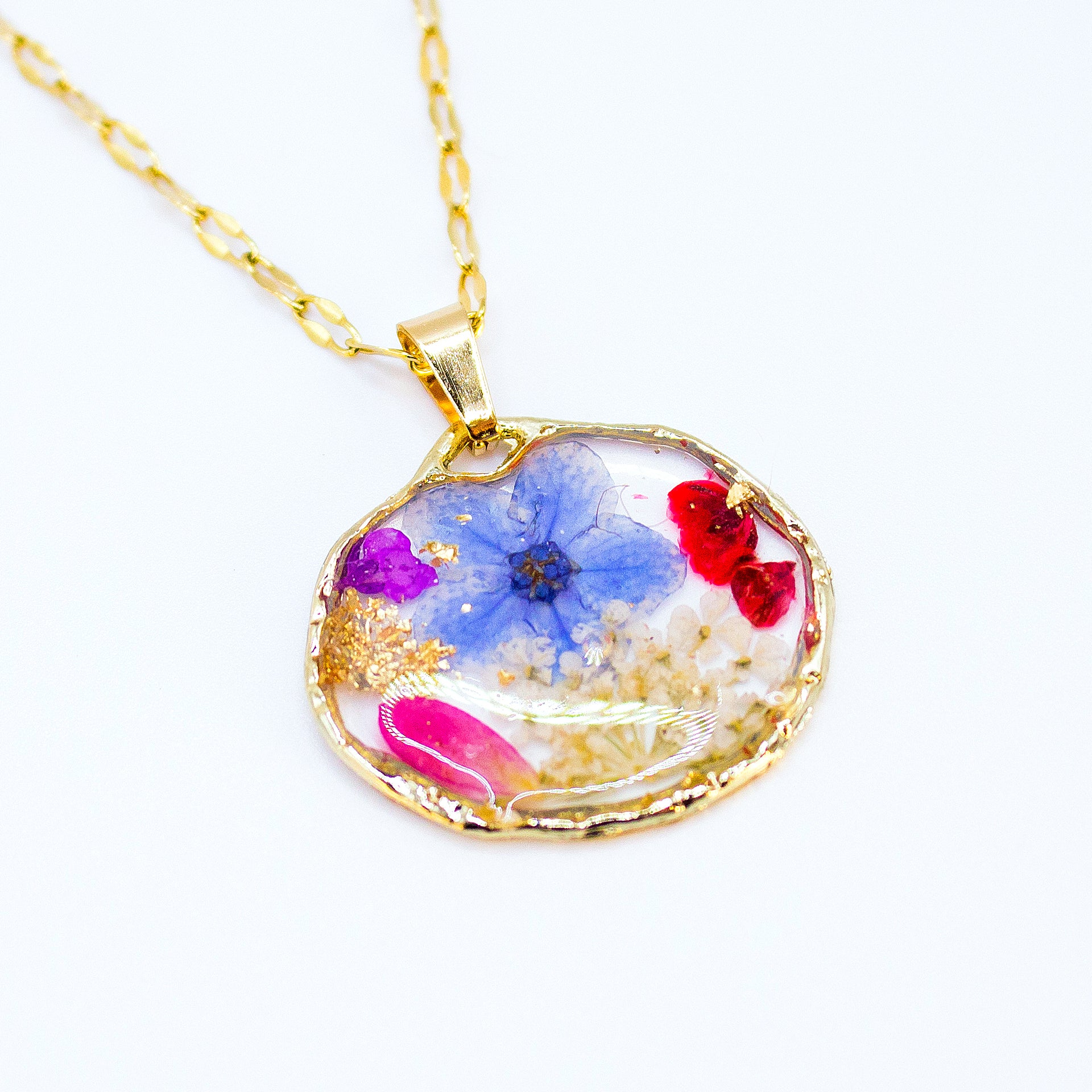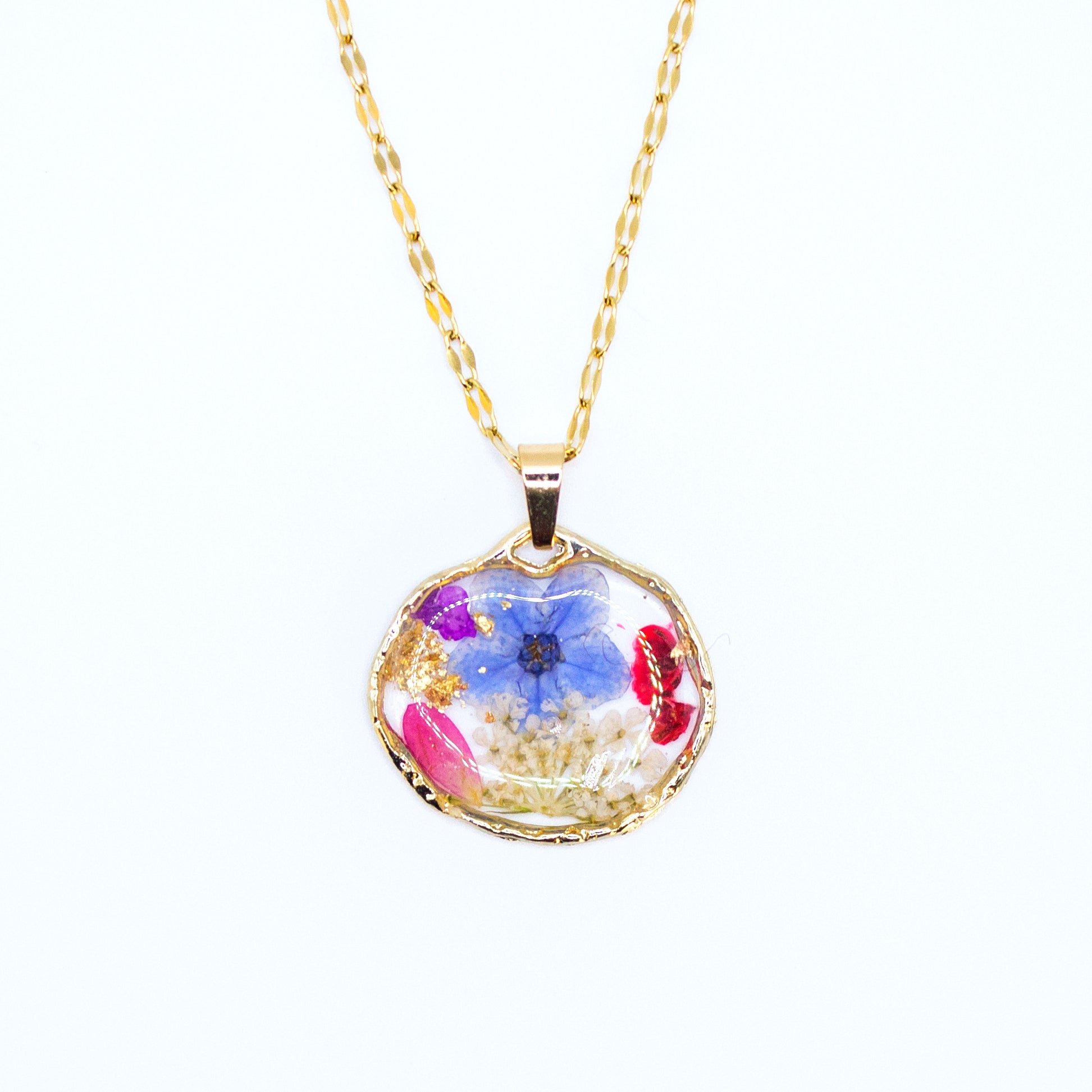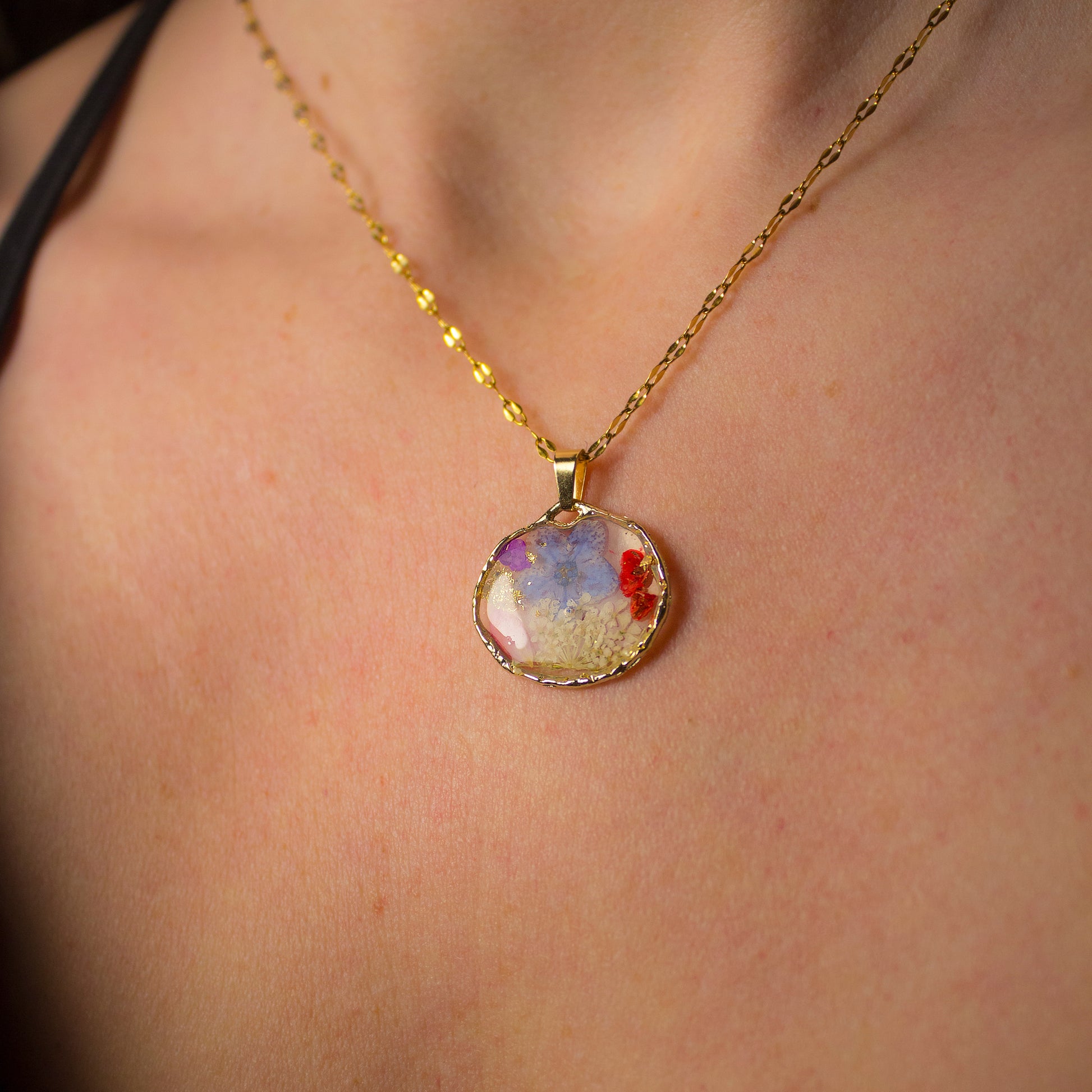 In resina e fiori veri, una composizione che ricorda un bouquet di fiori da indossare e portare sempre con sé, colorato, vivace e romantico.